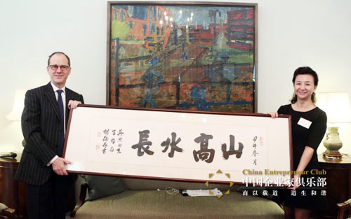 中國企業家俱樂部秘書長程虹向吳思田大使贈送書法作品