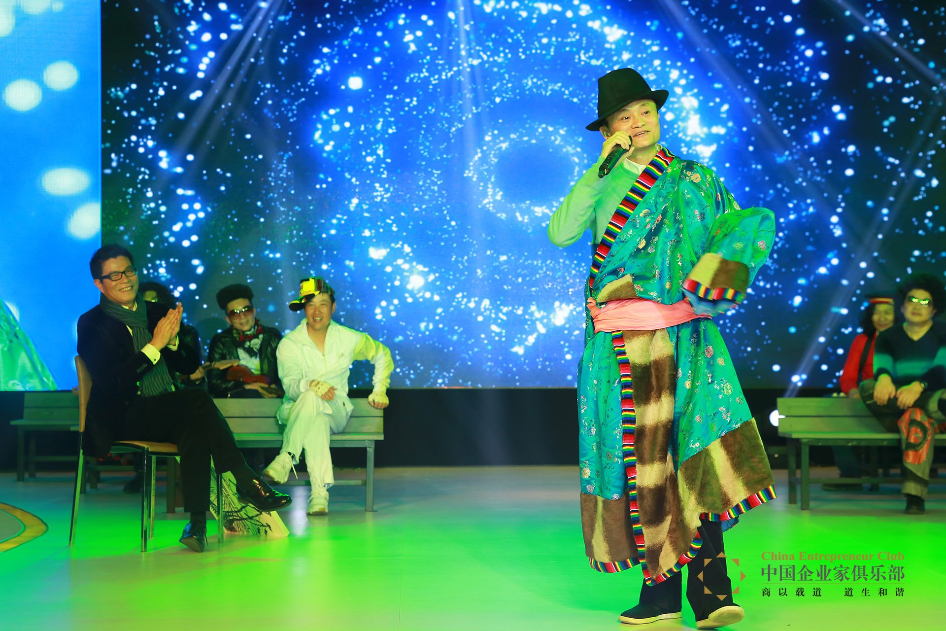 “文藝青年大篷車”節(jié)目中,由馮軍、俞春雷領(lǐng)銜的霹靂舞表演一下將氣氛引向高潮。而身著蒙古族服飾的馬云在無伴奏下清唱了一曲蒙古長調(diào)。