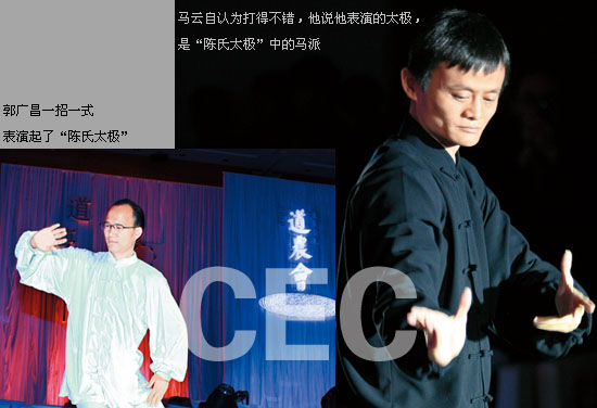 道農會一開場,中國企業家就展露出另外一種力量:濃縮的都是精華,馬云和郭廣昌再次為這句話做了注腳。他們不僅是中國企業家明星中的明星,還是倡導企業家群體走"身體路線"的先行者。近兩年,在一些非官方的企業家座談會上,坐在座位上演練太極動作成了馬云的標志。后發先至的郭廣昌則把太極變成了一門生意,復星集團投資的太極養生館聚集了一眾名師,意欲將連鎖經營拓展至海外。更重要的,用意不用力,無極而太極,吞下"太極大力丸"的郭廣昌,能在多大程度上讓復星的內功精進?