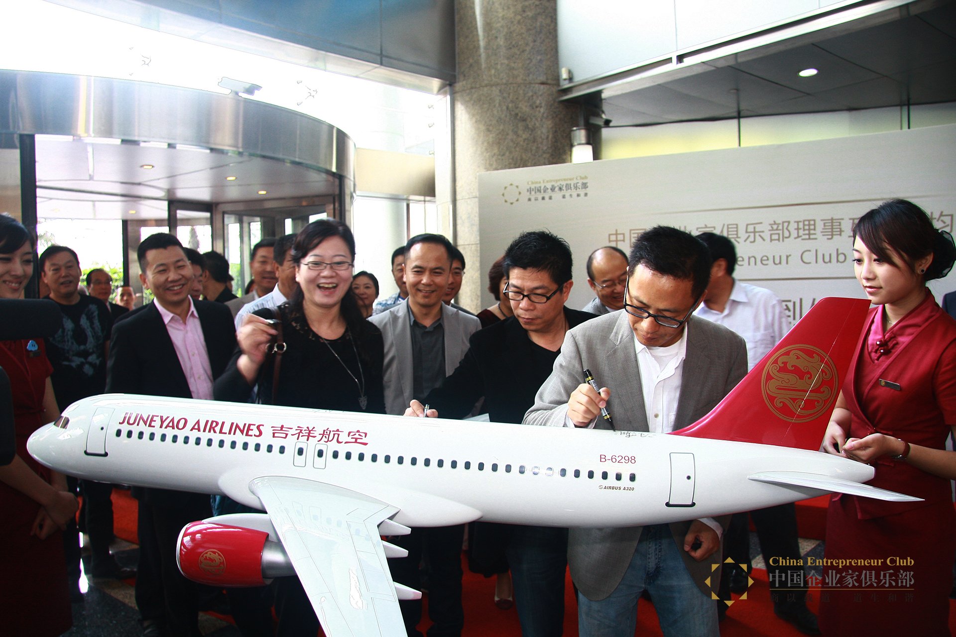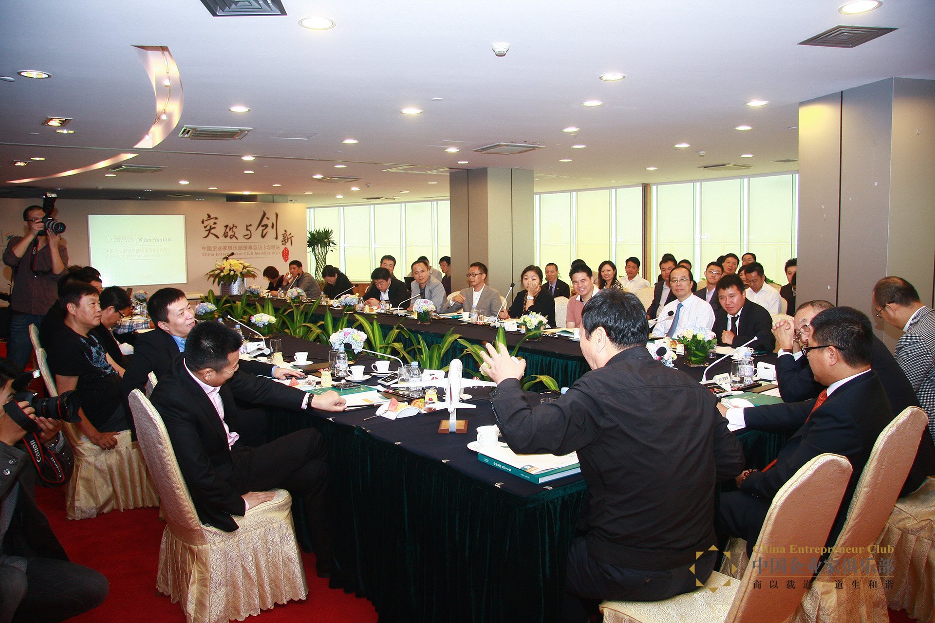 9月25日,全體參與互訪的理事來到上海均瑤集團總部,大家首先集體在總部一樓集體合影,理事們在均瑤集團核心業務吉祥航空的一架飛機模型上簽名留念。隨后,大家一起來到37樓均瑤集團榮譽室參觀,并聽取了均瑤集團總裁王均豪對公司發展歷史的介紹。接著,上海政協主席馮國勤親切接見了中國企業家俱樂部理事,他表示民營企業占上海企業的四分之一,解決的就業卻超過70%,所以說民營企業是國家的脊梁和希望。