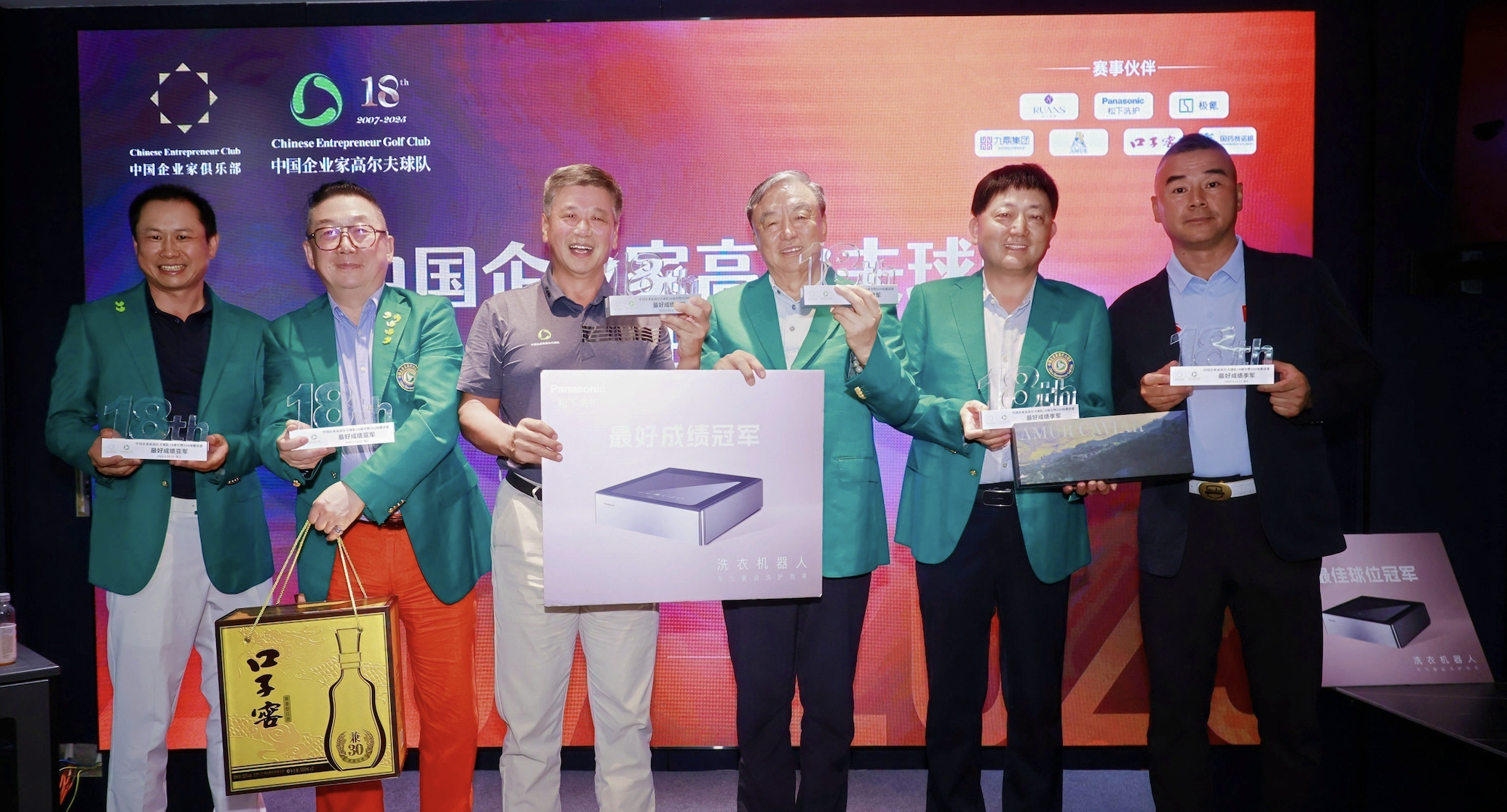 三組獎品依次為松下阿爾法洗衣機器人、口子窖兼30兼香型白酒、阿穆爾魚子醬。同時胡優華(右2)獲得兩天團隊比賽的關鍵先生,獎品為松下阿爾法衣物護理機。