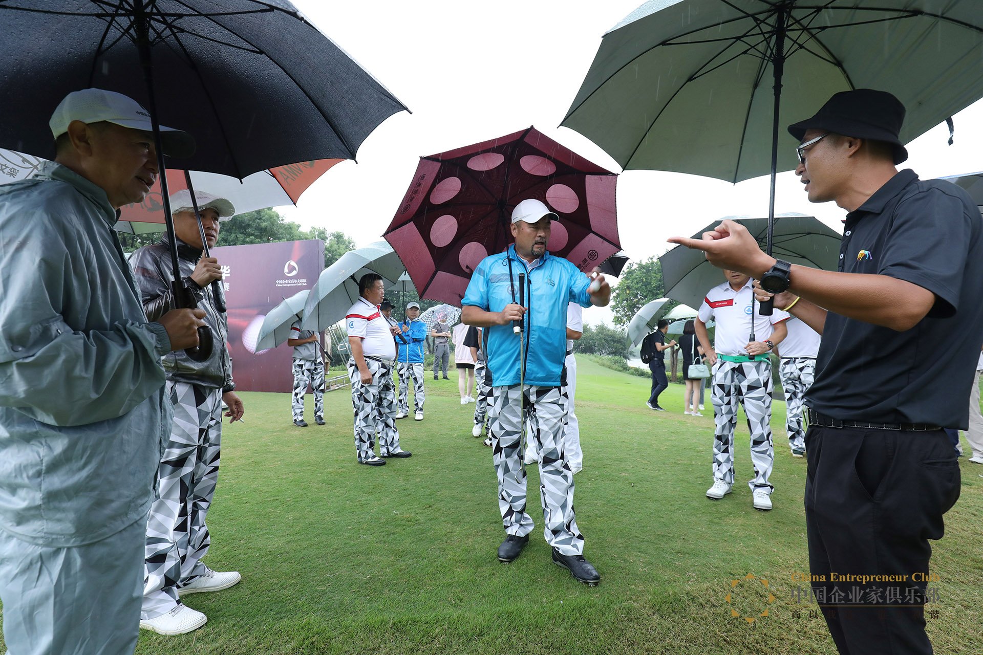 比賽開始前,中國企業(yè)家高爾夫球隊顧問張醒生、球隊副隊長兼北隊隊長張岷、球隊南隊副隊長王禮賢與國際級裁判顧軍討論調(diào)整規(guī)則,以在大雨天保持球賽的競技感和趣味性,并為第二天的隊際比賽保留體力。